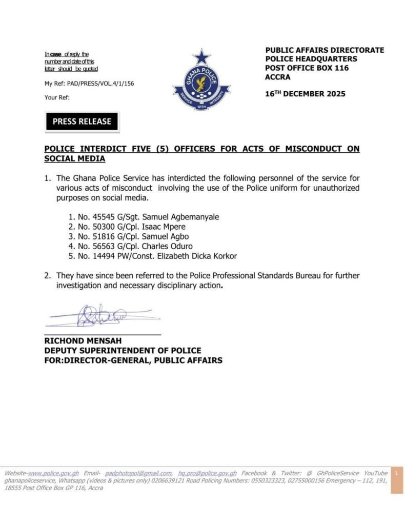 The Ghana Police Service has interdicted five officers for engaging in various acts of misconduct on social media, specifically involving the unauthorized use of police uniforms.