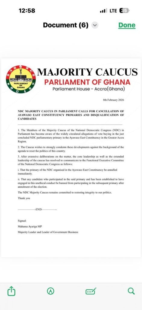 The Majority Caucus, after thorough deliberations involving both its core and extended leadership, has resolved to formally request the Functional Executive Committee of the NDC to annul the Ayawaso East primary immediately and to bar from any subsequent contest any candidate proven to have participated in or facilitated such unethical conduct.