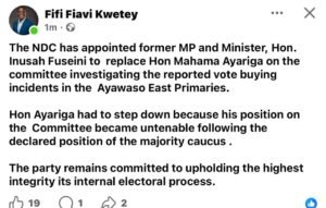“The NDC has appointed former MP and Minister, Hon. Inusah Fuseini to replace Hon Mahama Ayariga on the committee investigating the reported vote buying incidents in the Ayawaso East Primaries,” Fifi Kwetey posted.