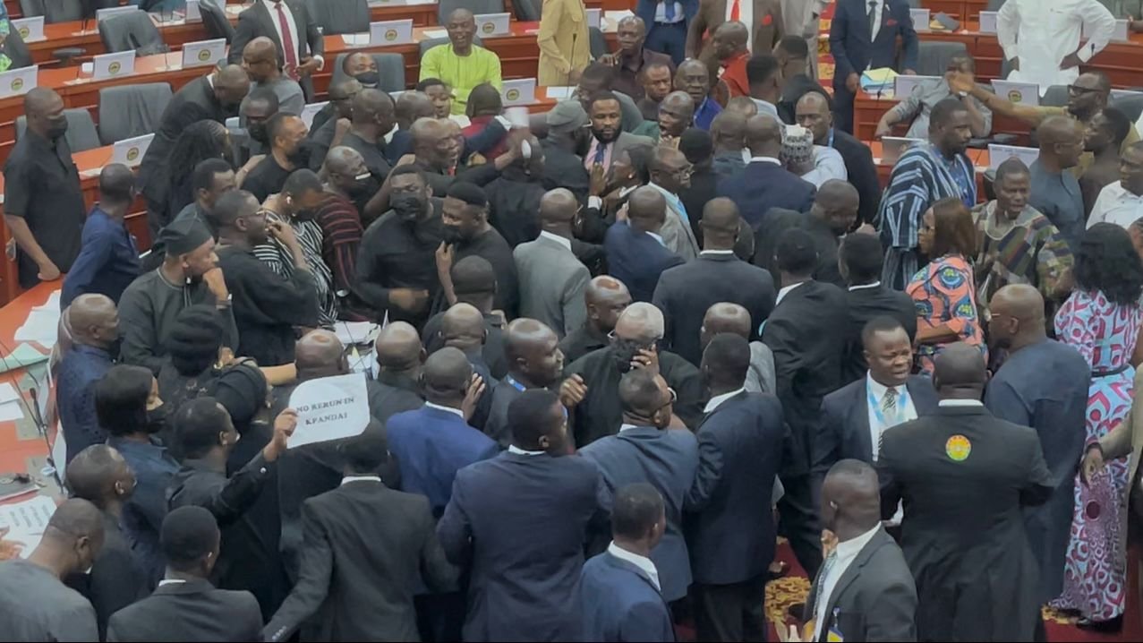 Pandemonium broke out on the floor of Parliament, with members of the Minority and the Majority Caucuses engaged in pushing and shoving.