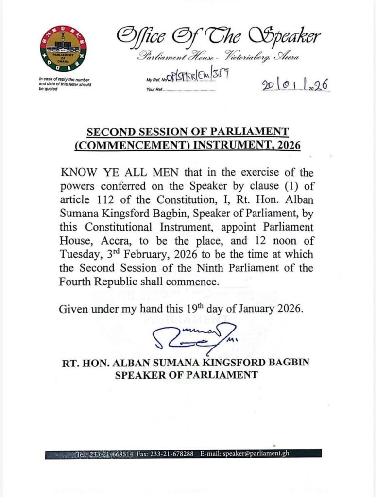 In line with Article 112(1) of the 1992 Constitution, the Speaker has set Tuesday, February 3, 2026, at 12:00 noon as the date and time for the session to begin at Parliament House in Accra.